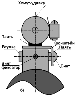 К самой втулке с помощью винта прикрепим Г-образный стальной кронштейн толщиной 2 мм. При этом на торце втулки и на соприкасающейся с ней поверхности кронштейна необходимо при помощи зубила выполнить радиальные насечки, обеспечивающие фиксацию соединения. Место контакта кронштейна с головкой винта пропаивается.