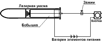 Лазерная указка "питается" от трех "пуговичных" батареек, емкость которых недостаточна для лазерного целеуказателя. Да и кнопка включения для наших целей не подходит.