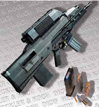 Пуля вылетает из укороченного ствола винтовки со скоростью значительно меньшей, чем у М 16 или g 36. Винтовка оснащена магазином от винтовки М 16 емкостью 20 или 30 патронов, хотя существуют более удачные образцы магазинов, которые могли бы заменить стандартный. Фиксатор магазина расположен и слева и справа, что также соответствует принципу двойного применения. Кроме унифицированного магазина, у М 16 "позаимствован" и штык.