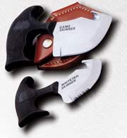 Еще в средние века в ножнах охотничьих тесаков устраивали специальные карманы для набора инструментов или хотя бы одного малого ножа. Эта тенденция сохранилась и до наших времен. Позднее в рукоятке ножей европейских образцов пытались поместить двухрядную пилу с распарывателем (рис. 7). Такая конструкция большим успехом не пользуется — основное лезвие мешает применять дополнительный инструмент, вместе с тем последний в сложенном состоянии делает рукоятку менее удобной для удержания при работе основным лезвием. Намного удобнее сделать в ножнах (на стороне, обращенной к телу) дополнительный карман для комбинированного вспомогательного инструмента, включающего отвертку, шило, консервооткрыватель, распарыватель и пр. Удачно скомпонованный и сделанный из нержавеющей стали с хорошей закалкой, такой инструмент увеличит массу всего набора лишь на 40–60 г, а общую толщину ножен — на 5–6 мм. Иногда на ножнах крепят брусок для заточки лезвия, однако более компактный вариант такого решения — носить в дополнительном кармане ножен алмазный надфиль (при необходимости укоротив его рукоятку), автомобильный надфиль для заточки контактов или просто пилку для ногтей с алмазным напылением. Рекомендуется покупать пилочку с мелким и равномерно нанесенным зерном, да и надфиль лучше брать не новый, чтобы поменьше царапать лезвие. Конечно, в стационарных условиях нож можно отточить идеально, однако в "поле" после открывания консервных банок и т.п. выручит даже такой "эрзац"-брусок.