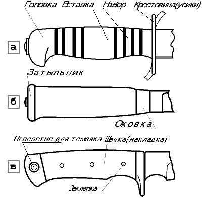Рис.4.Основные типы рукояток ножей: а —"финки"; б — финского ножа; в — с накладными щечками