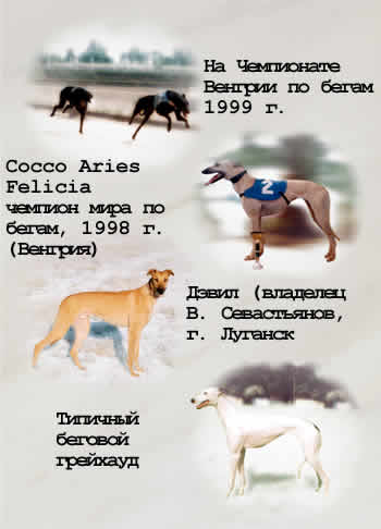 Спортивные грейхаунды обычно среднего и ниже среднего роста, крепкой конституции, с широким корпусом и очень развитой мускулатурой. Среди них встречаются и собаки более "легкого" сложения. Типичным представителем беговых грейхаундов является вывезенный из США walking Кermit (владелец Ковалев, г. Москва). Его "трудами" существенно улучшилось поголовье грейхаундов не только Москвы, но и Украины, он дал немало очень резвых потомков, среди которых полевой чемпион 1994 г. Фиджи из Вольного Ветра (владелец Рыкова, г. Киев). Выставочные грейхаунды, как правило, очень рослые, всегда длинных линий, с длинными рычагами и хорошо выраженными углами сочленений. Грудь очень глубокая, но зачастую слишком узкая, как и спина, а мускулатура недостаточно рельефна. Иногда это доходит до переразвитости, отнюдь, не способствующей ни быстрому бегу, ни удачной ловле. У нас, в Украине, популярность грейхаундов особенно возросла после триумфа на Всеукраинских состязаниях борзых 1994 г., где они еще раз показали, что являются не только самыми резвыми, но способны также ловить зверя вопреки бытовавшему среди охотников мнению. Полевым чемпионом тогда стала уже упомянутая Фиджи, взявшая русака в одиночку с превосходной резвостью и минимальным количеством угонок. Тогда же всех восхитила пара грейхаундов Баффи и Энергия (владелец Мазуркевич, г. Тернополь), которые по оплошности ведущего сорвались вместе со спутавшей их сворой и так в паре настигли зайца, били его на угонках, проявив незаурядную ловкость и выносливость, ведь скачки были по мокрой пашне.