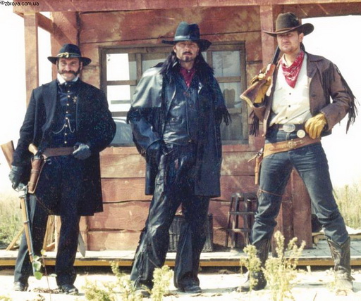 На фото справа — авторы статьи с певцом В. Малышевым в одежде и с оружием Дикого Запада
