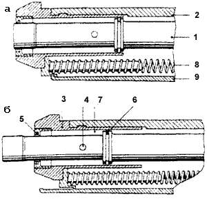 Ствол (1) жестко соединен с рамкой и охвачен затвором (2)(рис. А). В передней части затвора расположена втулка (3), которая вместе с проточкой на стволе образует полость цилиндра замедления (7). Полость цилиндра с торцов закрыта уплотнительными кольцами (5 и 6). После выстрела (рис. Б) пороховые газы через отверстие (4) в стенке ствола поступают в цилиндр и замедляют откат затвора. Преодолевая сопротивление пороховых газов, затвор откатывается назад, переднее уплотнительное кольцо (5) выходит на проточку ствола, газам открывается выход наружу, т.е. происходит сброс давления и затвор переходит в режим свободного затвора.