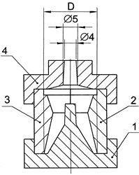 На рис. 1 представлена упрощенная схема конструкции пулелейки: 1) основание; 2,3) части разъемного корпуса; 4) крышка.
