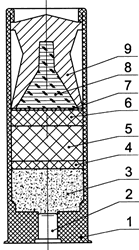 При снаряжении патронов пулями "Диаболо" (рис.3) рекомендуется брать: — пластмассовую или бумажную гильзу (1); — капсюль "Жевело" (2); — порох "Сокол" (3), используя патроны летом, массу пороха, которая указана в инструкции или на банке и является максимальной для данной партии, следует уменьшить на 0,2 г, а зимой — на 0,1 г; — картонную (плотную) прокладку (4), толщиной 2,5–3 мм, диаметр которой должен на 0,1 мм превышать внутренний диаметр гильзы; — войлочный осаленный пыж (5), толщиной 13–15 мм; — добавочный войлочный пыж (6) необходимой толщины (пыж разрезают накрест, складывают по линиям разреза и вставляют в гильзу); — картонную прокладку из рыхлого картона (7), толщиной 0,3–0,5 мм; — пулю (9), повернутую хвостовиком вверх, полость которого заполнена сухими, мелкими древесными опилками (8), и хорошо уплотненными. Опилки, просеянные через дуршлаг, являются амортизатором при выстреле и не дают "влипать" пыжу в хвостовик пули. Заливать полость хвостовика парафином (воском) не рекомендуется, поскольку парафин при выстреле выкрашивается неравномерно и пуля теряет свой баланс. Для того чтобы при снаряжении патрона опилки не высыпались, пулю следует держать хвостовиком вверх, гильзу надевать сверху до упора хвостовика в прокладку (7). Дульце гильзы завальцовывают закруткой.