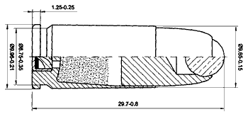 Пули таких патронов имеют довольно длинную цилиндрическую ведущую часть, которая сужается лишь в верхней четверти пули. Вершина пули оживальной формы полая внутри. Диаметр отверстия в верхней части пули составляет 5,3 мм, глубина — 8 мм. Передняя часть отверстия ступенчатая, что позволяет прочно удерживать маленький шарик диаметром 5,7 мм из твердого пластика синего цвета. Масса всей пули — 6,2 г.