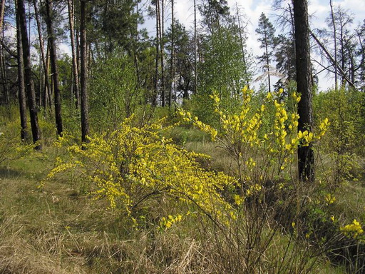 Апрельское утро. Расцветает природа, со всех сторон спешит навстречу. Прохладный лесной воздух бодрит и пахнет свежей зеленью прорастающих трав. На кустах и деревьях первые листики только-только раскрываются, блестя как лаковые. Голубовато-синяя медуница мелькнет среди орешника, пахнёт тонким ароматом фиалка. Поют дрозды. Косуля вдруг дорогу перепрыгнет, или сбоку в сторону побежит. Невдалеке от дороги небольшой холм с мачтовыми соснами. Там на прогалинах и среди стволов кусты дрока желтым цветут. Холм от них будто золотой в малахите, окруженный зеленью пушистых сосновых посадок. У сосенок, растущих по краю, на втором колене от вершин метки лосиных зубов белеют, напоминая о прошедшей зимней поре.