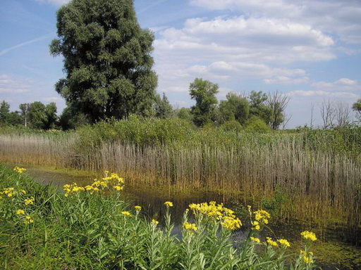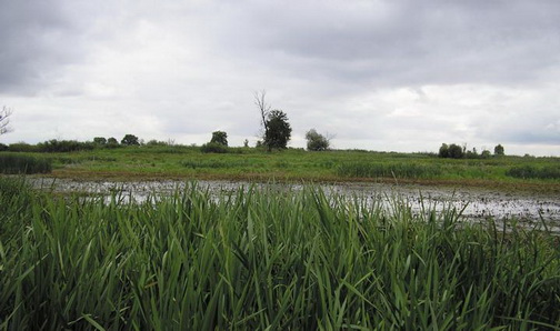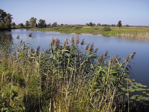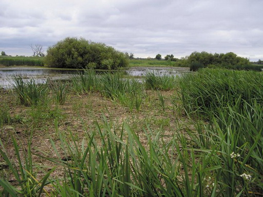 Поодаль завиднелась какая-то впадина с метелками тростника, лозовыми кустами и небольшими ракитами, тянущаяся в стороне от нашего пути. Я пошел на разведку. При моем подходе там поднялась серая цапля и вылетела сорока. На дне впадины было мелкое озерко-лужа с множеством обсохших ракушек у мутной воды и крестиками птичьих следов на мокром иле. Мы пошли дальше и вскоре подошли к извилистому, заросшему сусаком и стрелолистом, где узкому, а где и широкому озеру, подобно речке, вьющемуся через луга.
