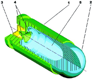 В теле цельностальной пули, имеющей полетную массу 4,5 г (рис. 2), расположена полость 1 для размещения в ней порохового заряда. На боковой поверхности пули, ближе к ее корме, имеется кольцевой концентратор напряжений 2, который разделяет пулю на головную 3 и донную части 4. В донной части 4 сформировано запальное отверстие 5.