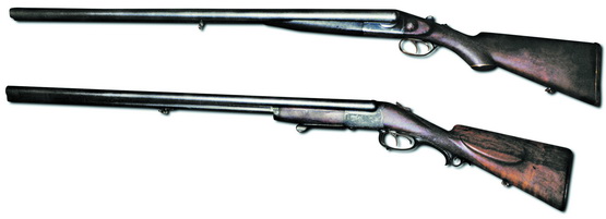 Тройник (на фото 1 внизу; вверху для сравнения — двустволка 10-го калибра работы одного из парижских оружейников со стволами Леопольда Бернарда) представляет собой классический вариант: вверху два гладких горизонтально спаренных ствола 12-го калибра, нижний ствол — нарезной под патрон 11х65 мм c цилиндрической гильзой.