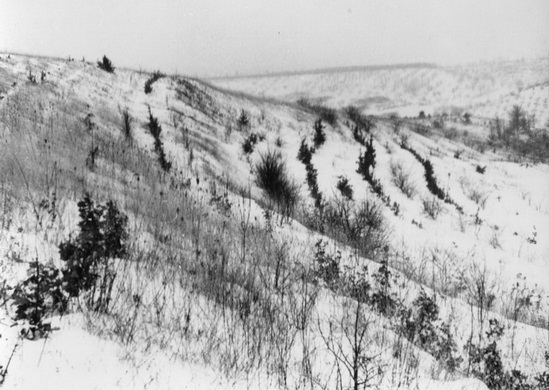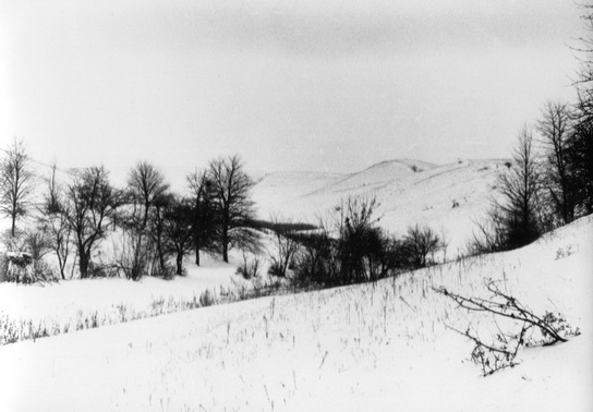 Обойдя село полями у вершин оврагов, поворачиваем в сторону реки Рось. Там снова попадаем в балки и овраги. В них продолжают попадаться следы косуль, зайцев и лисиц. Вижу, как далеко впереди по склону идут гуськом три косули. Отец показывает мне место, где ночевала стайка куропаток. На ровной площадке подветренного склона, на снегу темнело девять кучек помета из двухцветных «колбасок». Здесь дикие курочки провели ночь, сидя кружком среди невысоких травок. Пересекаем разлогую балку с молодыми посадками дуба, тянущимися лентами вдоль склонов, с кустами боярышника, терна, шиповника и негустых бурьянов.