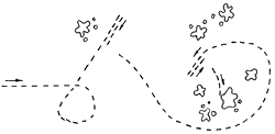 Перед лежкой заяц всегда делает несколько петель, пересекает свой след (см. рисунок): сдвойки (возвращается по своему следу назад) и скидки (длинные прыжки после сдвойки в сторону).
