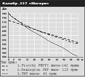 Рис.11.Изменение кинетической энергии поражающих элементов патрона .357 "Magnum" |