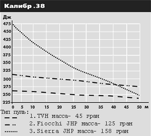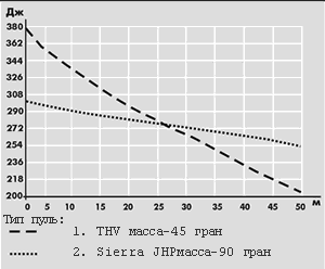 Однако, приведенные выше характеристики резко изменяются с увеличением дистанции выстрела из-за небольшой массы пули, которая составляет 45 гран (2,925 г).